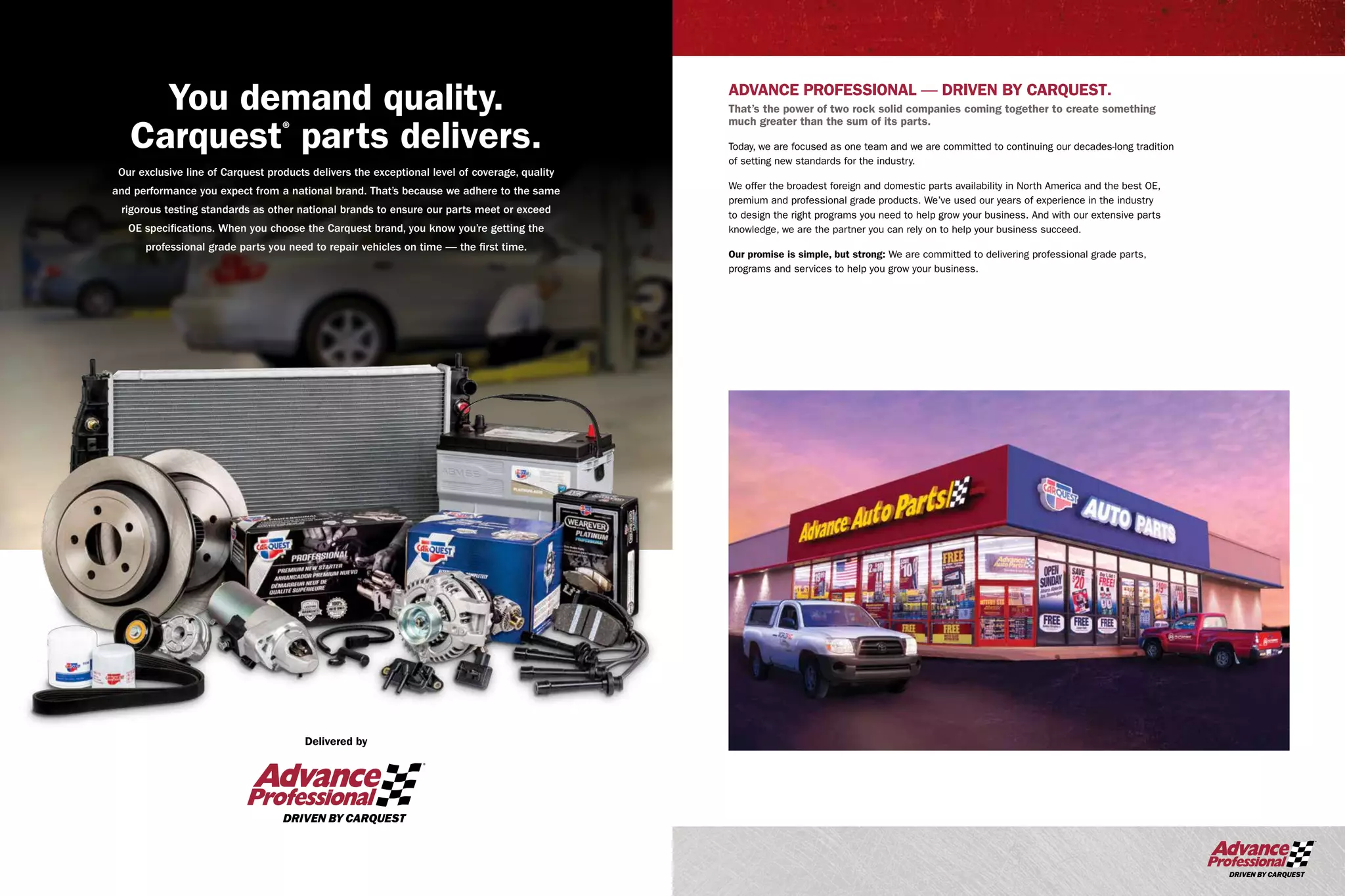 The document summarizes the parts and services offered by Advance Professional to auto repair shops. It provides details on their extensive inventory of parts from major brands to ensure 99% coverage for domestic and foreign vehicles. It highlights programs and support for shops including training, marketing solutions, loyalty rewards, and dedicated commercial account managers. The goal is to be a full-service partner to help auto repair shops grow their business.