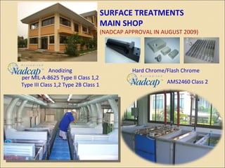 The document outlines the capabilities and certifications of CCS Groups' various divisions, including surface treatments and aerospace bracket manufacturing. It emphasizes NADCAP certifications for multiple processes such as anodizing, passivation, and non-destructive testing. Additionally, it highlights quality equipment and calibration services used in the manufacturing and inspection processes.