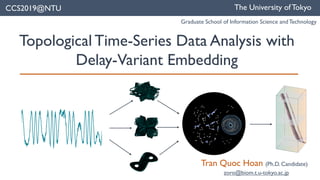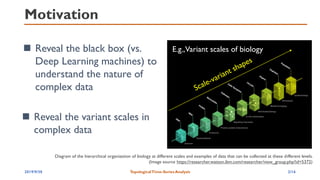 The document discusses topological time-series data analysis using delay-variant embedding, emphasizing the importance of understanding complex data structures through topological features. It introduces concepts such as persistent homology and the significance of holes in high-dimensional spaces, illustrating methods for analyzing time-series data dynamics. The proposed delay-variant embedding method aims to enhance the representation of time-series characteristics in a robust way against noise perturbations.