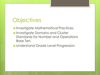This document discusses Common Core Math standards and the progression of number and operations in base ten from kindergarten to fifth grade. It outlines the key objectives for each grade level, including decomposing numbers, place value understanding, and the four operations with multi-digit whole numbers and decimals. The document also describes how the Common Core represents a shift towards developing conceptual understanding, procedural fluency, and engaging students with the mathematical practices.