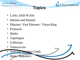 The document provides an overview of key concepts related to local area networks (LANs) and wide area networks (WANs). It discusses common LAN technologies like Ethernet, Fast Ethernet, and Token Ring. It also covers topics such as protocols, media, topologies, collisions, transceivers, network interface cards, and hubs/repeaters. The document is intended as a chapter in an introductory networking course.