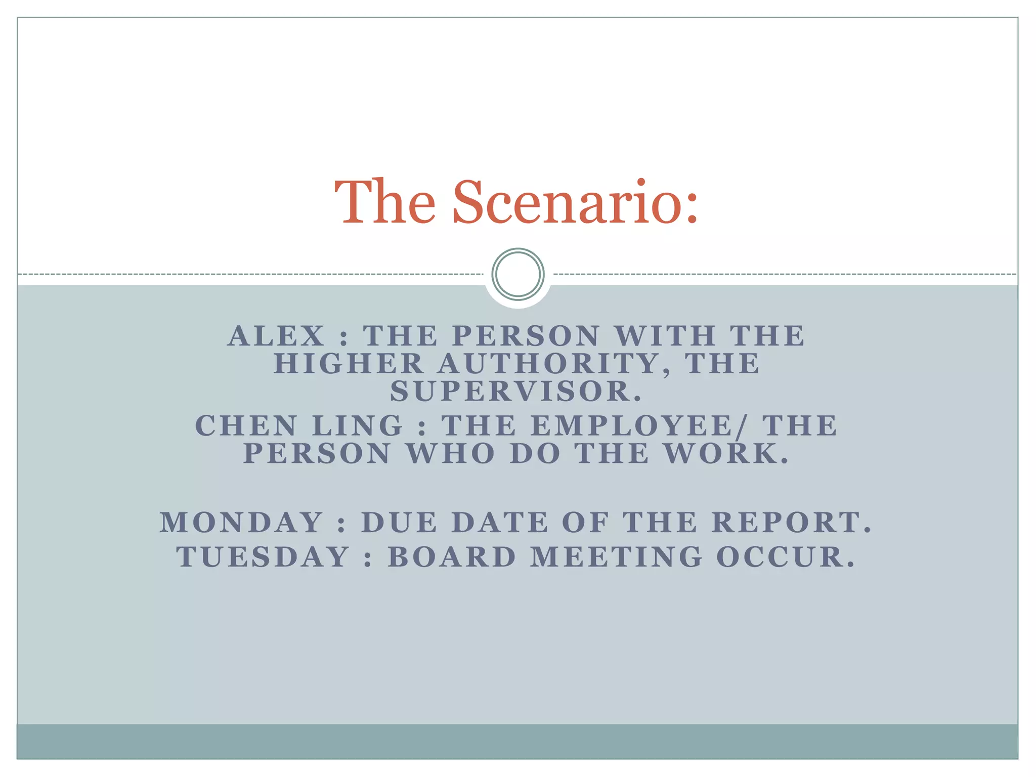 The document presents a scenario involving a supervisor, Alex, and an employee, Chen Ling, discussing their perspectives on a report due for a board meeting. Both characters face pressure due to last-minute notifications, leading to an analysis of their communication and stress levels. The assignment includes a task to improve their conversation for better understanding and roles in the presentation.