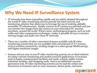 IP surveillance systems utilize expanding IP networks to provide global, real-time video monitoring solutions that surpass traditional CCTV functionalities. They offer features such as remote access, wireless connectivity, and higher image resolutions, making them suitable for diverse applications including banks, schools, and public venues. Such systems not only enhance security but also serve as revenue generation tools for attractions like zoos and museums.