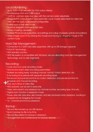The document details the features and specifications of the AVI-16C-DVR1030 digital video recorder, which supports advanced H.264 video compression, dual stream capabilities, and simultaneous VGA and CVBS output for efficient surveillance applications. It is designed for reliability and flexibility, supporting various recording modes, hard disk management, and remote access functionalities. It is suitable for home or small business surveillance, with a user-friendly interface and multiple advanced features including PTZ control and alarm management.