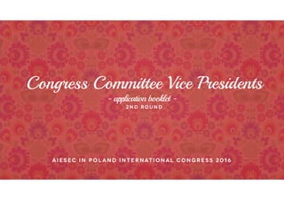 The document is an application booklet for the AIESEC International Congress 2016 in Poland, detailing the roles, key responsibilities, and application process for committee vice president positions. It emphasizes the significance of the congress for both AIESEC and Poland, calling for passionate individuals to contribute to its success. The application process requires submissions by April 3rd, and outlines specific criteria and questions for candidates.