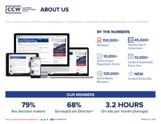 The document is a media kit for Customer Contact Week Digital, detailing its extensive online community of over 150,000 members involved in customer contact and CX professions. It outlines various engagement opportunities through reports, webinars, summits, and sponsorship packages, alongside demographic insights about the community. Additionally, it emphasizes the value of the platform for lead generation, content creation, and industry insights tailored for decision-makers in various sectors.