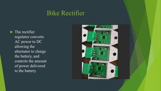The document discusses the CD 70cc bike rectifier, which converts AC power to DC for battery charging and regulates power delivery. Key components include diodes, bridge rectifiers, zener diodes, resistors, and capacitors, highlighting their functions, advantages, and disadvantages in electronics. It also mentions the BT151 silicon-controlled rectifier and includes a quotation from Albert Einstein.