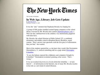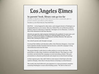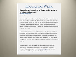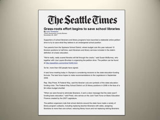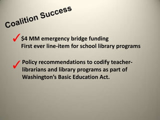 The document outlines the vision of the Washington Coalition for School Libraries and Information Technology, aiming for every public school in Washington to be served by a full-time certified teacher-librarian and fully-funded library resources. It emphasizes the urgency of addressing educational disparities, technological access, and the need for a robust curriculum that includes 21st-century skills. Additionally, it highlights the importance of innovative approaches in education to prepare students for a rapidly changing information landscape.