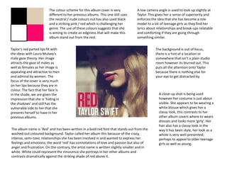 This album cover uses neutral colors like beige to portray Taylor Swift as innocent and pure. A mid-shot is used where Taylor is looking to the side rather than at the camera to maintain her familiarity with fans while still showing her natural expression. The font and album title "Fearless" convey a sense of empowerment while overcoming obstacles.