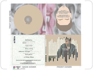 The document describes the design of a digipak for a music album. The digipak uses conventional forms like displaying the artist name and album title on the front cover. Research informed choices like using an artist image on the front cover. Elements like fonts and images are carried throughout the digipak to create continuity. While conforming to typical designs, the inclusion of artist quotes on the inside cover provides a unique, personalized touch. Overall, the digipak challenges conventions slightly with this interior element, but otherwise adheres closely to professional forms and styles.