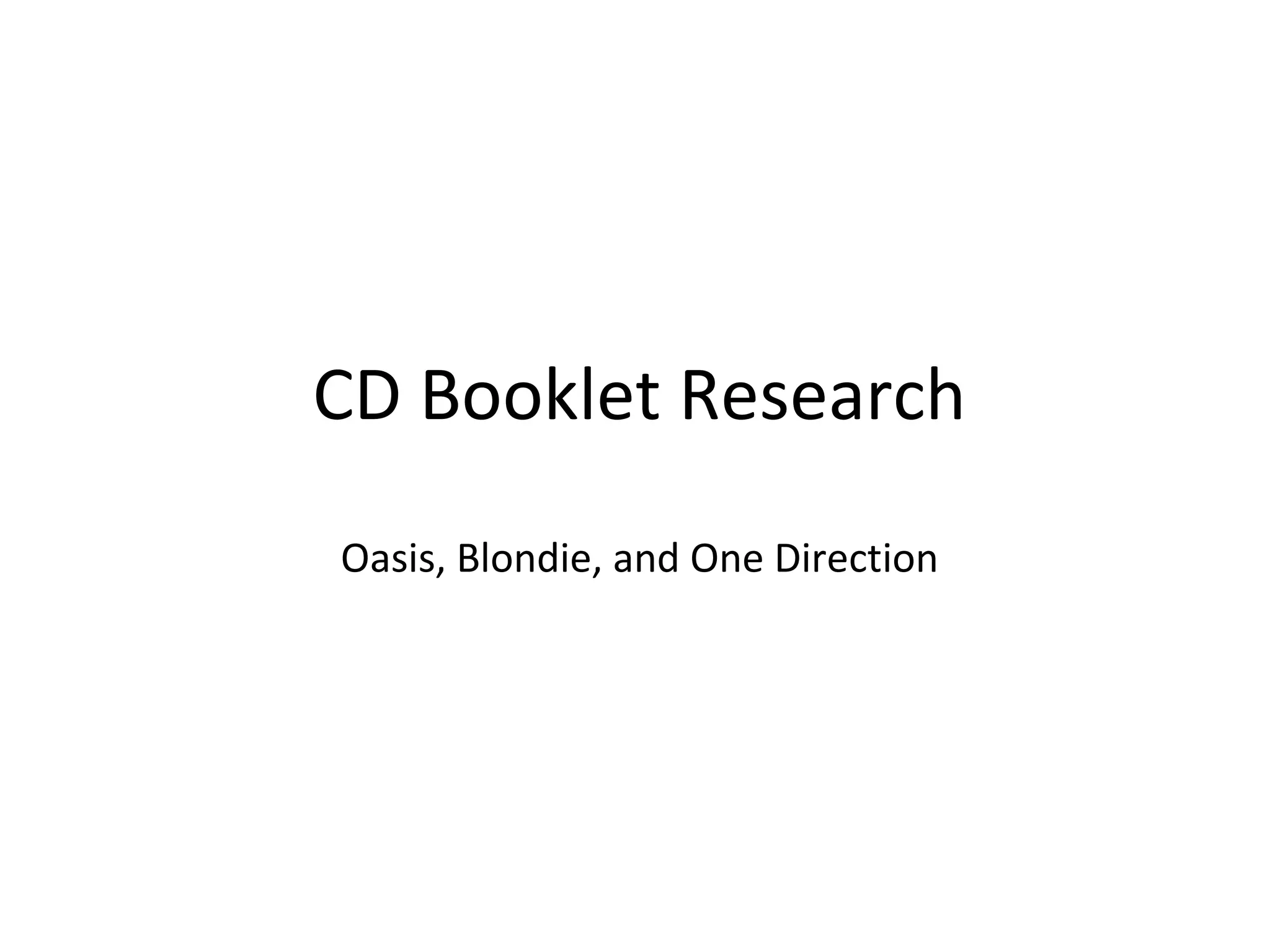 This document summarizes and compares the CD booklets of albums by Oasis, Blondie, and One Direction. For Oasis' album Morning Glory, it describes the front cover photo and details found in the booklet layout. For Blondie's albums Parallel Lines and Plastic Letters, it discusses the consistent black and white color scheme and images used. For One Direction's single What Makes You Beautiful, it analyzes the bright front cover contrasting with the plain back and connections to the music video.