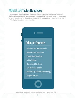 This document provides guidance for maximizing mobile app sales. It outlines a sales methodology focusing on benefits over features, targeting social networks, using storytelling, and asking for the sale. It also describes the mobile app sales lifecycle of acquisition, installation, usage, and renewal. Common objections are addressed and qualifying questions are presented. The Small Business CRM tool is highlighted for tracking sales performance.