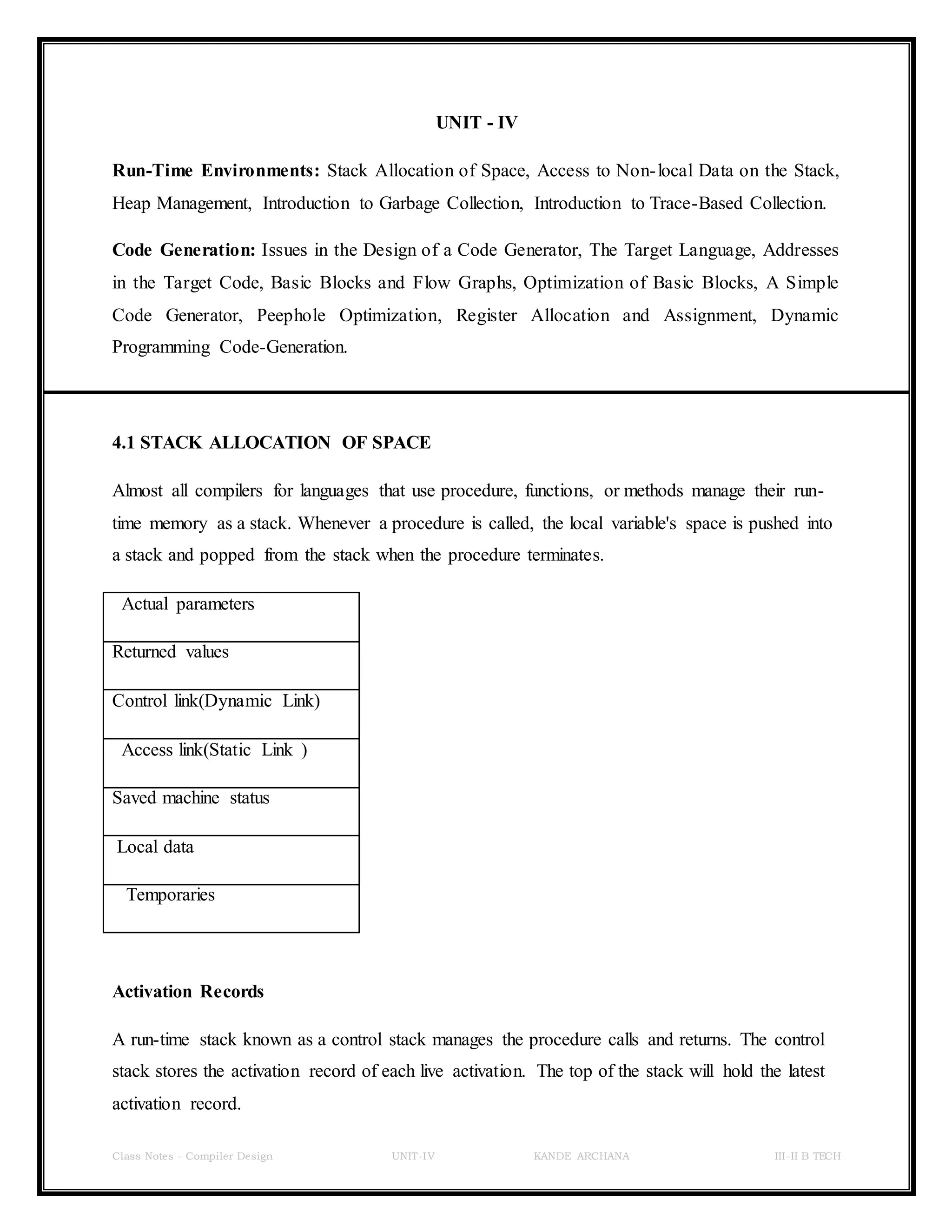 The document discusses compiler design topics like run-time environments, code generation, and garbage collection.