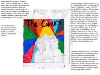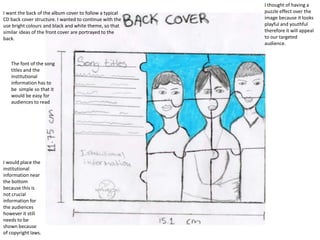 The document discusses the design plans for a band's album cover. It describes using colorful beams shooting from the band on the front cover to represent their musical ideas. The band will be placed in the middle surrounded by a bright beam to draw attention. Song titles will be in a curly font near the bottom. The back cover will continue the bright color and black/white theme. Simple fonts will list the song titles and institutional details near the bottom. The inner sleeve photo will show a drum set to appeal to the band's young rock/pop fans.