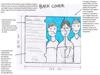 The document discusses the design plans for a band's album cover. The front cover will feature the band's name in bold black font against a colorful, eye-catching background incorporating beams of colored light shooting from the band. Their image will be centered with a bright beam drawing attention. The album title "Canvas" will appear smaller at the bottom in a curly font. The back cover will continue the bright color and black-and-white theme while listing song titles and details simply. The inside sleeve will simply feature a photo of a drum set to appeal to the band's young target audience.