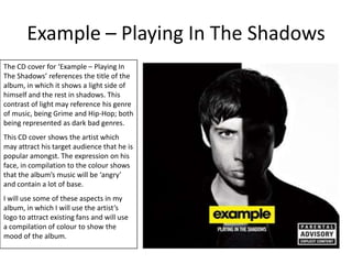 This document discusses CD cover designs for various artists and what design elements were effective at representing the music's genre and mood, as well as attracting the target audience. The author analyzes covers for Example, Cornershop, Jason Mraz, and Nizlopi. Elements like use of artist logos, vibrant colors, images from music videos are discussed. The author concludes they will incorporate these techniques like use of their music video images in their own CD cover design to promote recognition and appeal to their audience.