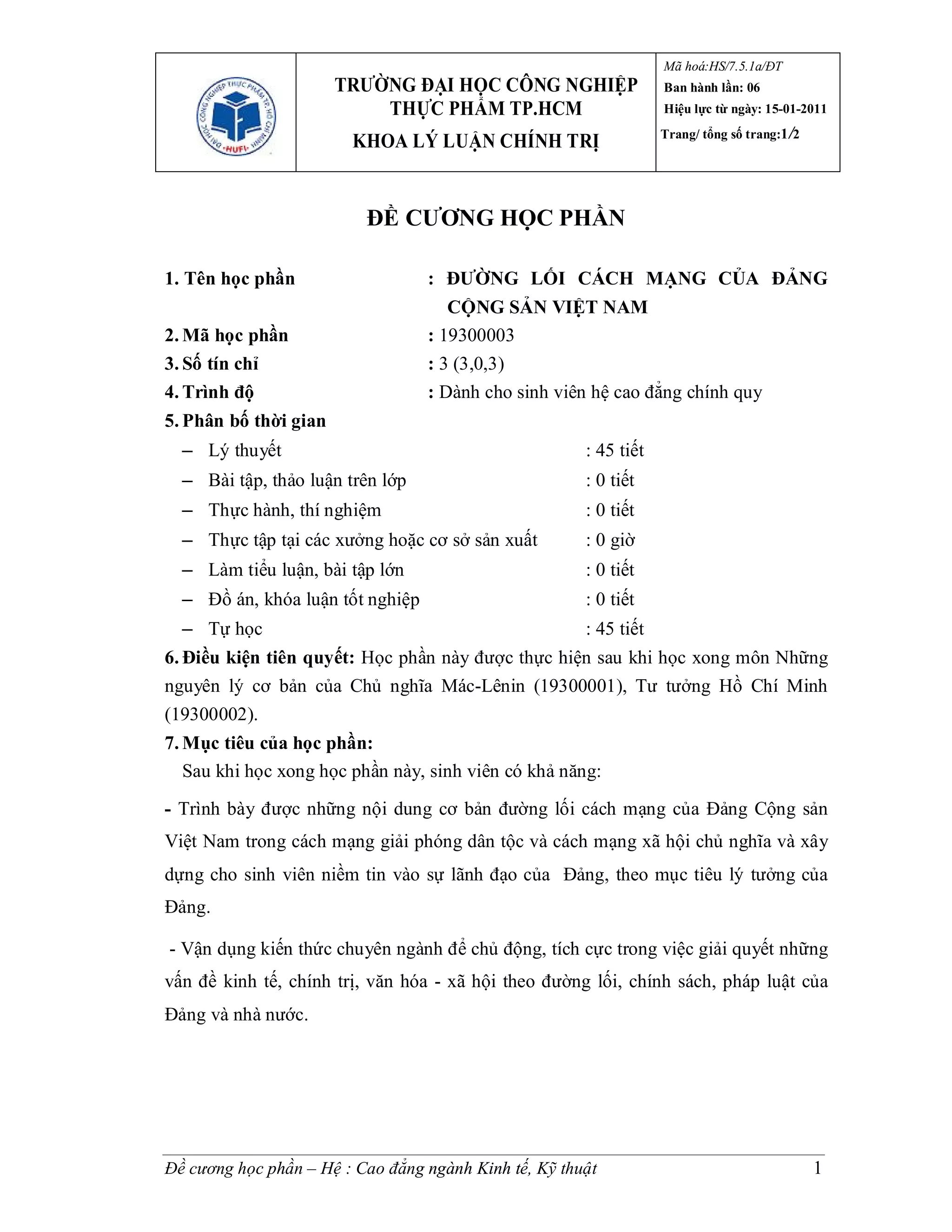 Học phần 'Đường lối cách mạng của Đảng Cộng sản Việt Nam' thuộc chương trình cao đẳng có 3 tín chỉ, bao gồm 8 chương và yêu cầu sinh viên phải hoàn thành môn học trước. Mục tiêu của học phần là giúp sinh viên hiểu về đường lối lãnh đạo cách mạng và vận dụng kiến thức trong các lĩnh vực kinh tế, chính trị, văn hóa - xã hội. Nội dung học phần tổng hợp các giai đoạn lịch sử của Đảng và những chủ trương, chính sách quan trọng trong tiến trình cách mạng Việt Nam.