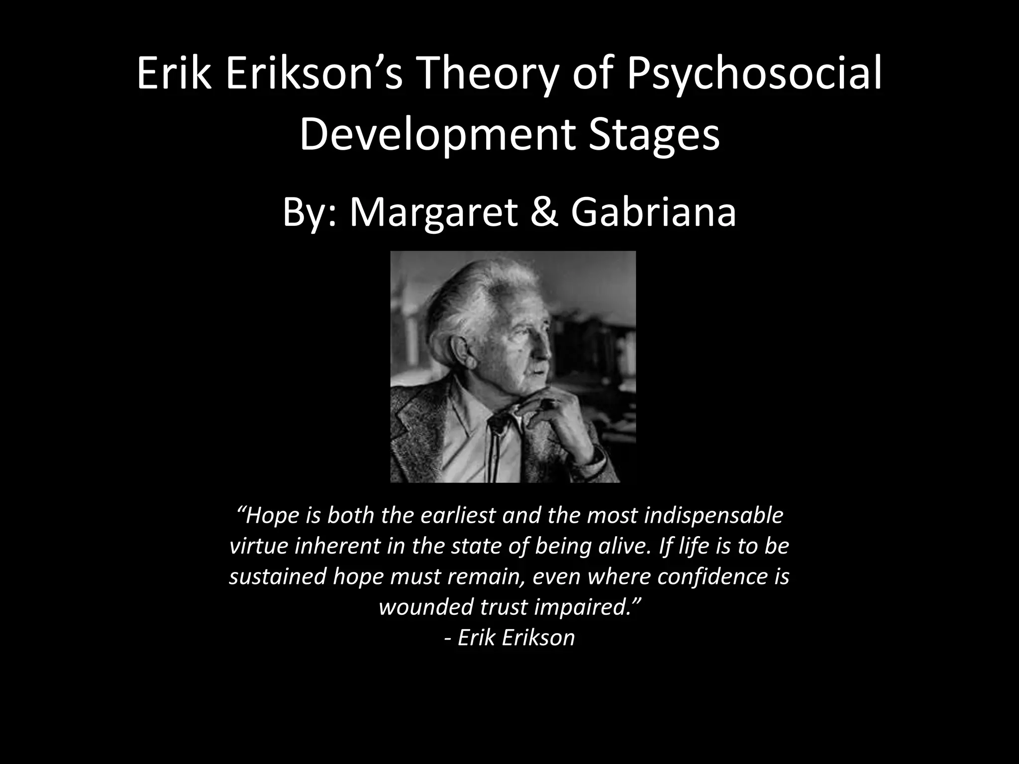 Erik Erikson's theory of psychosocial development proposed 8 stages that people progress through from infancy to late adulthood. The first stage, trust vs mistrust, occurs from birth to 1 year as infants develop trust or mistrust based on the dependability of their caregivers. The second stage, autonomy vs shame and doubt, takes place in early childhood as toddlers learn independence in controlling their bodily functions. The third stage, initiative vs guilt, happens in preschool years as children begin to assert themselves and direct play, developing a sense of initiative or guilt. Erikson believed that successfully completing each stage leads to healthy development.