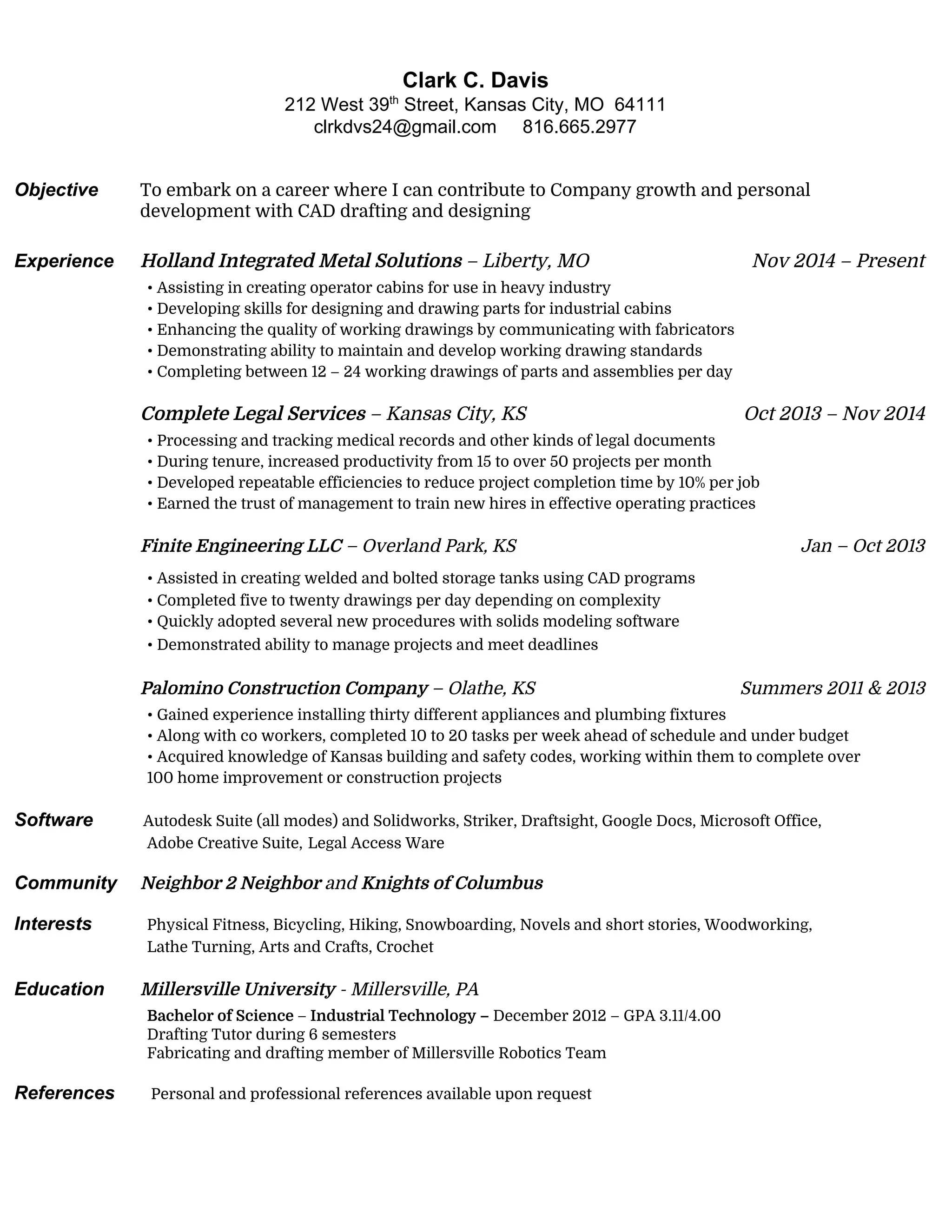 Clark C. Davis is seeking a career where he can contribute to company growth through CAD drafting and designing. He has over 5 years of experience in CAD drafting, having worked at Holland Integrated Metal Solutions designing operator cabins and developing drawings. He also has experience processing legal documents at Complete Legal Services where he improved productivity. Clark is proficient in Autodesk, Solidworks and other CAD software and received a Bachelor's degree in Industrial Technology from Millersville University.