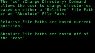 This document is a tutorial on using the 'cd' (change directory) command in the Mac terminal. It explains how to navigate directories, handle spaces in directory names, and use shorthand for changing to the home directory or root directory. The document also covers absolute paths for changing directories and provides examples to illustrate these concepts.