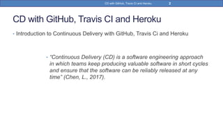 This document provides a step-by-step guide on implementing Continuous Delivery (CD) using GitHub, Travis CI, and Heroku for a Spring Boot application. It covers project setup, creating necessary configuration files, and ensuring CI/CD is properly configured for automatic deployments. Additionally, security measures for handling API keys and creating a Procfile for Heroku deployment are discussed.