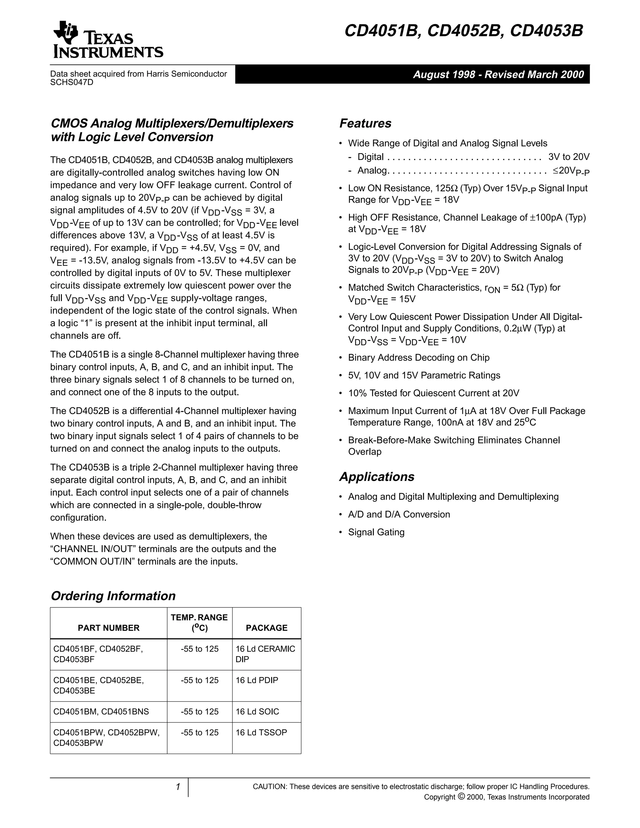 The document provides specifications for the CD4051B, CD4052B, and CD4053B CMOS analog multiplexer/demultiplexer integrated circuits from Texas Instruments. It describes their key features such as wide ranges for digital and analog signal levels, low ON resistance, high OFF resistance, and logic-level conversion. Tables provide truth tables, pinouts, maximum ratings, thermal information, and electrical specifications for the devices over temperature.