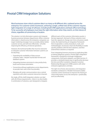 Pivotal CRM Integration Solutions provides a framework to integrate customer data across different business systems and applications. This helps create a single view of the customer and share critical information enterprise-wide. The framework uses a combination of solutions like middleware, adapters and web services to integrate CRM systems with other applications. It addresses challenges like integrating data from various sources and formats, connecting different departmental software, and merging customer interaction channels.