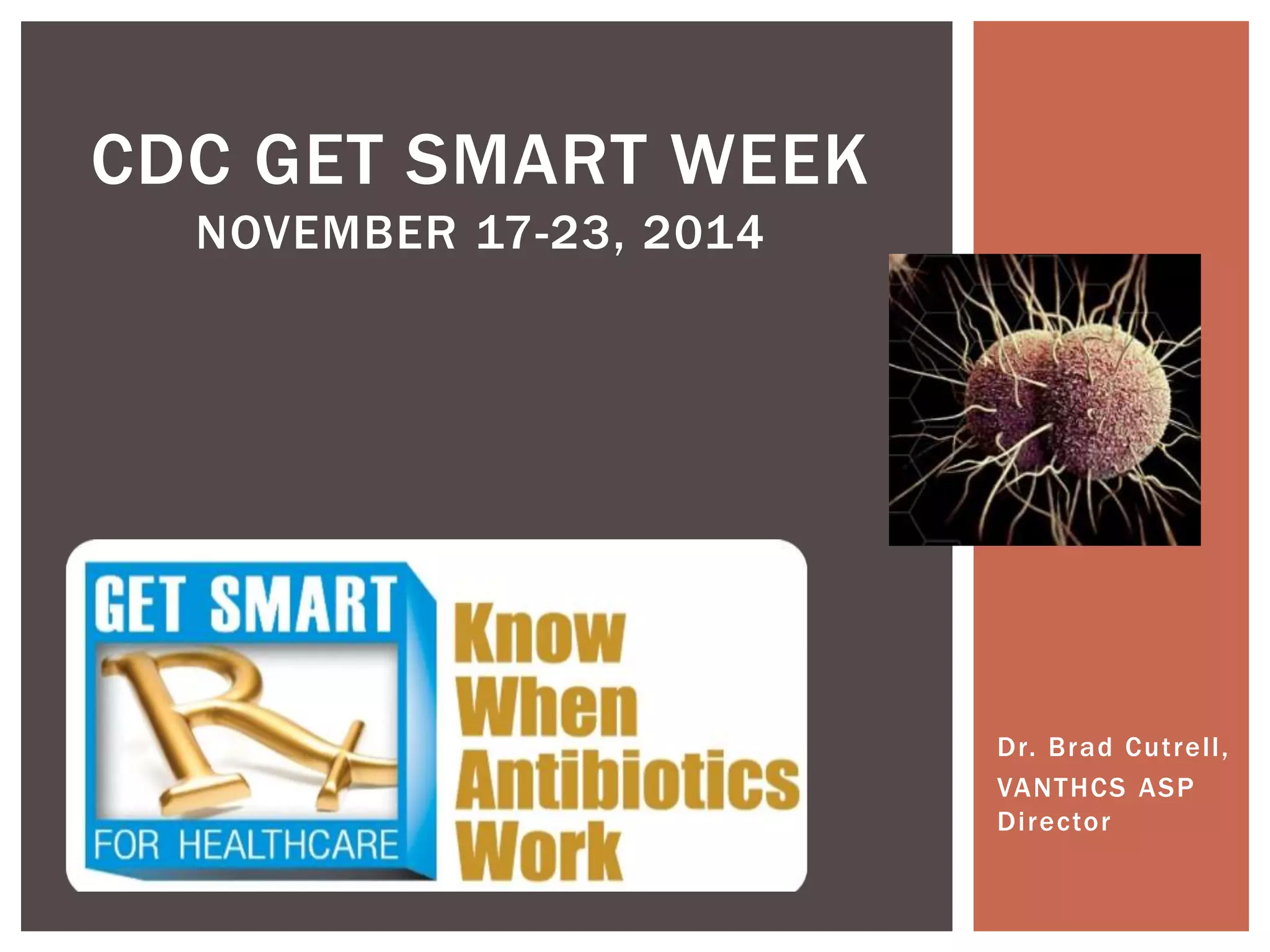 This document discusses antibiotic overuse and resistance. It notes that overuse of antibiotics can lead to adverse drug events, antibiotic resistance, and Clostridium difficile infections. It summarizes the 2013 CDC Threat Report on antibiotic resistance and lists several "superbugs" as major threats. The document advocates for antibiotic stewardship programs and lists seven ways healthcare providers can improve antibiotic prescribing practices to help address the growing crisis of antibiotic resistance.