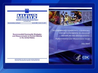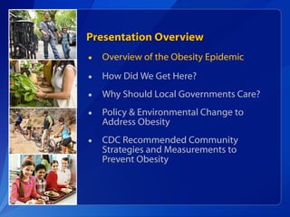 This document discusses strategies that local governments can implement to address the obesity epidemic based on recommendations from the CDC. It provides an overview of the rising trends in obesity in the US from 1990 to 2009. Some key factors that contributed to increased obesity rates are the increased consumption of sugar-sweetened beverages and fast food, lack of physical activity, and community designs that discourage walking and biking. The document argues that local governments should care because obesity rates affect healthcare costs and productivity. It recommends that local governments enact policies and create built environments that make healthy eating and active living easier through initiatives like increasing parks and improving walkability.