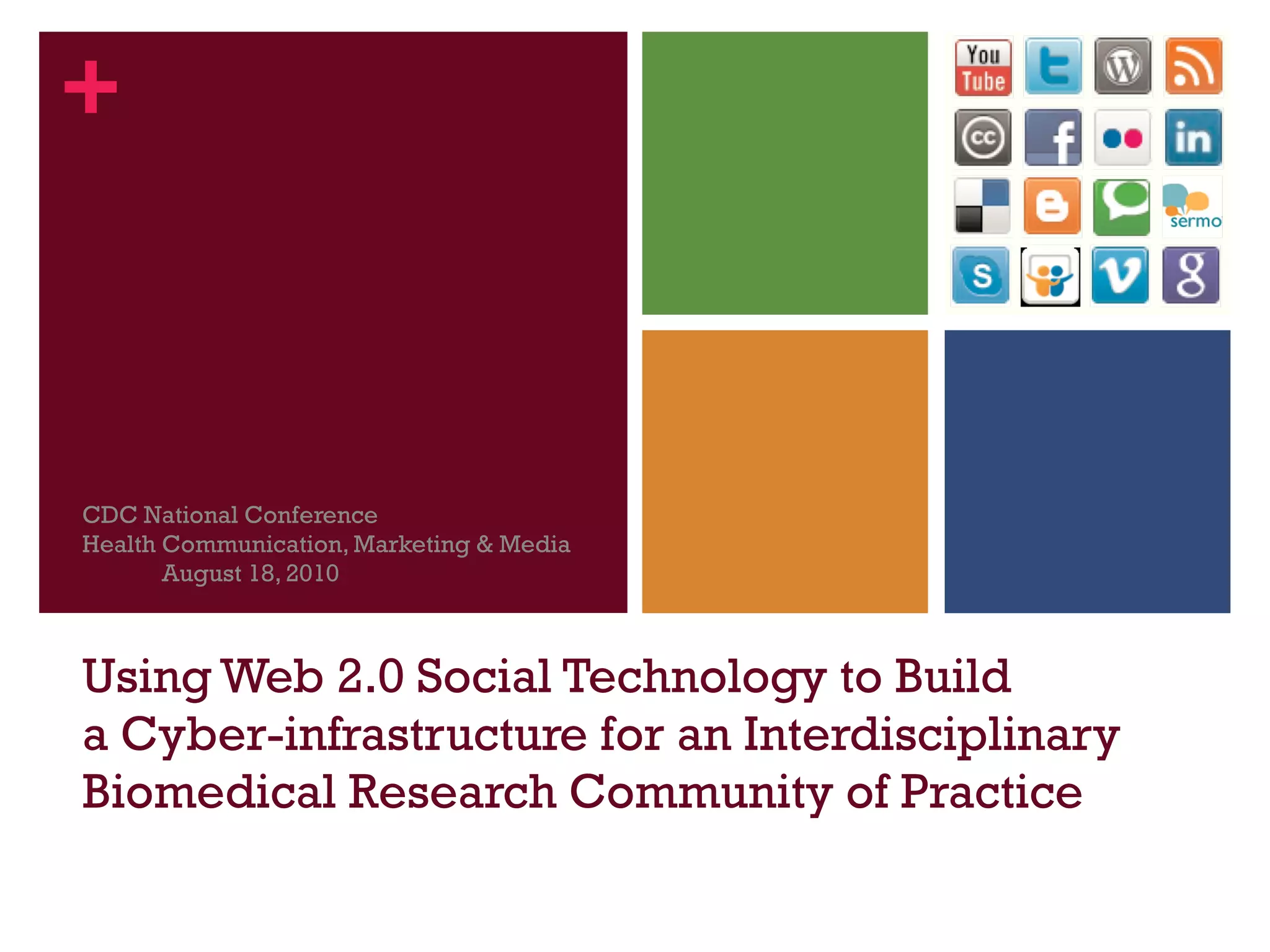 This document summarizes a study that evaluated the use of Web 2.0 social technologies like wikis to facilitate collaboration among an interdisciplinary biomedical research community. The study found some adoption of a wiki by the community members, with barriers including time constraints and technical skills. Benefits included shared resources without additional costs. Ongoing research was recommended to further analyze usage and outcomes over 12 months.