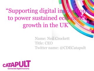 This document discusses the UK's Centre for Digital Built Britain (CDEC) and its work supporting digital innovation. CDEC focuses on three initial sectors - creative & media, digital health, and digitally enabled cities. It faces four key challenges around data usage and developing new digital products and ideas. CDEC works with universities, businesses, and clusters across the UK to identify collaboration opportunities in these sectors and help innovative ideas reach the market. The document provides Bristol as an example opportunity for collaborative projects linking researchers, creative innovators, and challenges in healthcare and cities.