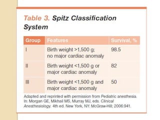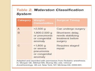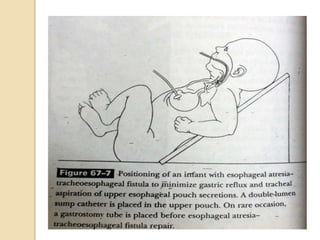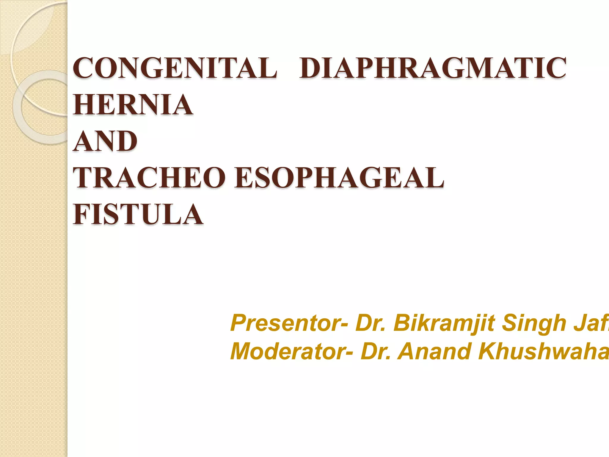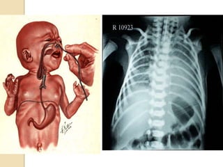 This document discusses congenital diaphragmatic hernia and tracheoesophageal fistula. It begins by defining congenital diaphragmatic hernia and describing the different types. It then discusses the history, embryology, pathophysiology, classification, clinical manifestations, diagnosis, treatment including surgical repair, complications, and prognosis of congenital diaphragmatic hernia. It also defines tracheoesophageal fistula, describes the different types, discusses embryology, pathophysiology, clinical presentation, diagnosis, associated anomalies, preoperative preparation, surgical repair techniques, and complications.