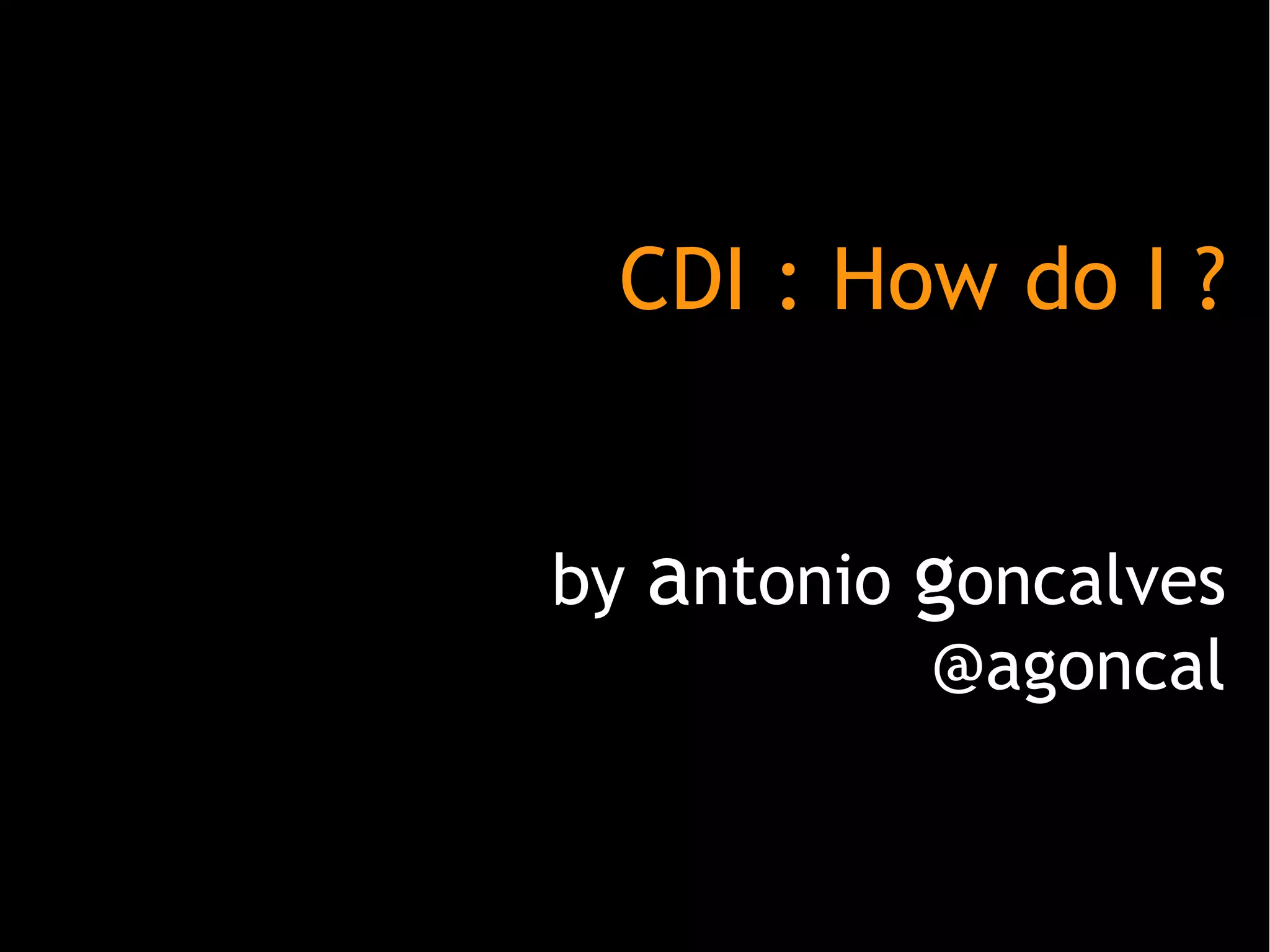 The document discusses various aspects of Contexts and Dependency Injection (CDI) in Java EE, including how to use @Inject for dependency injection, qualifiers to select specific implementations, producers to provide dependencies, and events to communicate between components in a loosely coupled way. It also demonstrates CDI concepts like qualifiers, producers, scopes, and alternatives through examples.