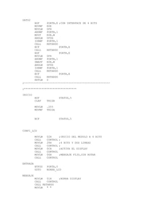 This document contains code for initializing and sending data to an LCD module using a PIC microcontroller. It includes macros and subroutines for initializing the LCD, sending control signals and data, and displaying the message "HOLA MUNDO" on the LCD screen. When the user presses a button, the display will be cleared and the message will redraw.