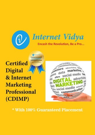 Internet Vidya is an education company based in New Delhi, India that provides online and in-person professional courses in digital marketing, ethical hacking, and self-development. It offers a Certified Digital & Internet Marketing Professional (CDIMP) course that teaches skills like search engine optimization, social media marketing, email marketing, Google AdWords, and web analytics through online instructor-led training and hands-on projects. The course aims to help students gain career-ready skills and secure job placements in digital marketing fields.