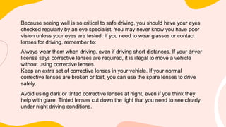 Driving at night is more dangerous than during the day due to issues with drivers' vision, fatigue, roadway lighting, and vehicle lighting. Some key risks include impaired vision at night, glare from oncoming headlights, fatigue from lack of sleep, difficulty seeing pedestrians and animals on the roadway, and other drivers under the influence of alcohol or drugs. It is important for drivers to take regular breaks when fatigued, ensure proper vehicle lighting is clean and functional, and drive more slowly at night to allow for greater reaction time.