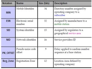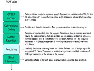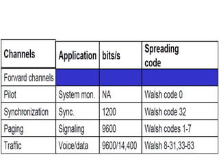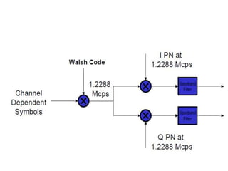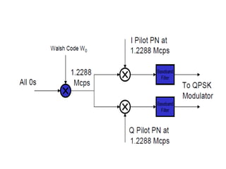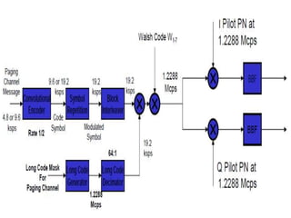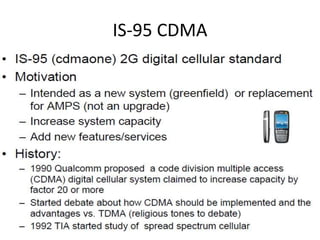 IS-95 CDMA is an air interface standard that uses code division multiple access (CDMA). It employs various techniques to improve system capacity and performance, including bandwidth recycling, power control, soft handoffs, diversity combining, and variable rate vocoding. Key aspects of IS-95 include the use of quadrature phase shift keying modulation at a 1.2288 Mcps chip rate, forward error correction coding, and multiple logical channels (pilot, sync, paging, traffic) defined using orthogonal Walsh codes.