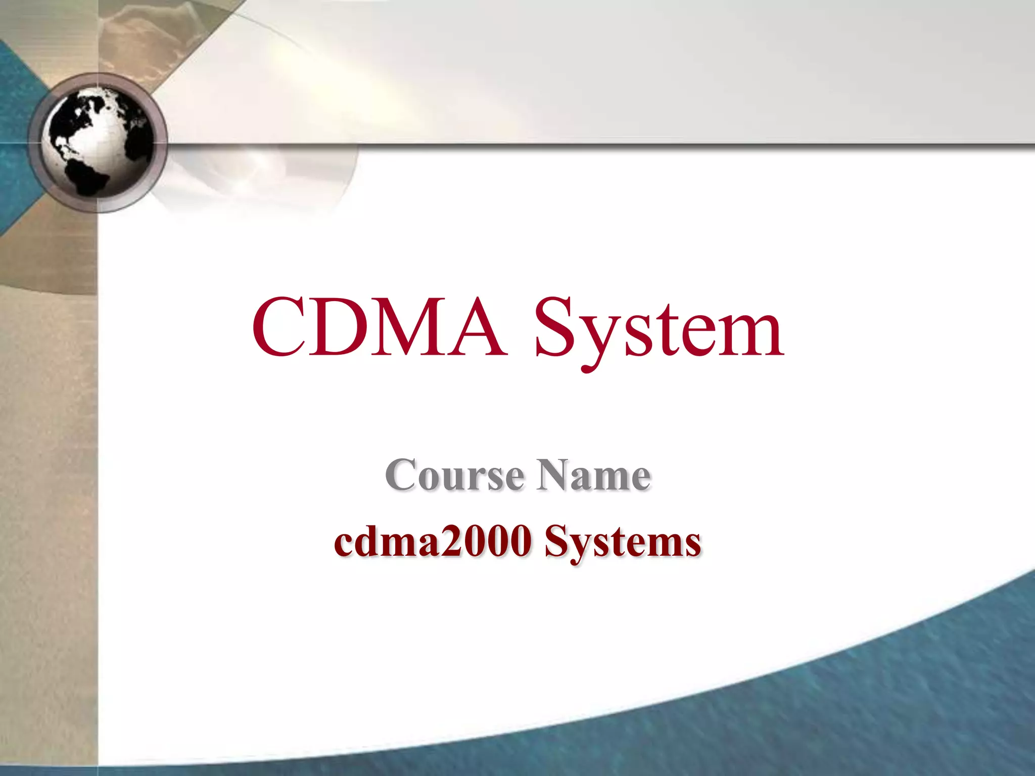 CDMA systems use code division multiple access (CDMA) to allow multiple users to access the network simultaneously using the same frequency band. CDMA uses spreading codes to distinguish between users, allowing signals to overlap in both time and frequency. Key aspects of CDMA include soft handoff which provides better call quality during handoffs, rake receivers which mitigate multipath interference, and intelligent vocoders which provide high quality voice compression. CDMA networks also use power control and simple network planning to provide better coverage than comparable systems while using less infrastructure. The cdma2000 1x standard provided increased data speeds and backward compatibility with earlier CDMA networks.
