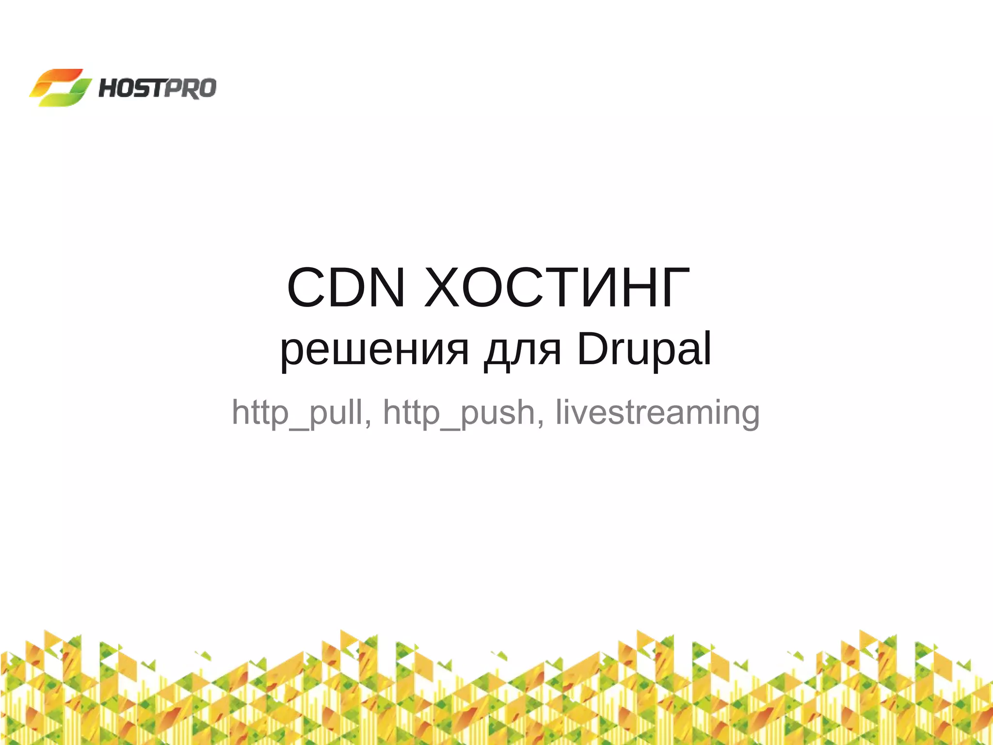 Документ описывает CDN (Content Delivery Network) как ресурс для оптимизации доставки контента на сайты, включая использование приёмы http_pull, http_push и livestreaming. CDN обеспечивает высокую скорость, доступность и низкую стоимость при доставке статического и потокового контента. Также упоминается статистика использования и преимущества, такие как высокая надежность и простота установки для сайтов на Drupal.
