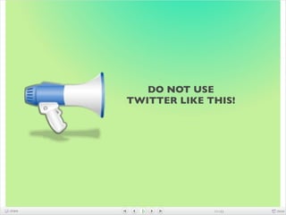 This document provides an overview of social media and digital marketing topics. It includes links and brief descriptions related to the usage and demographics of social platforms like Facebook, Twitter, and blogs. Specific tips are given on growing followers on Twitter and using hashtags, along with recommendations for tools to schedule posts, embed profiles, and stay updated on trending topics. The impact of digital media on marketing and sales is also briefly discussed.