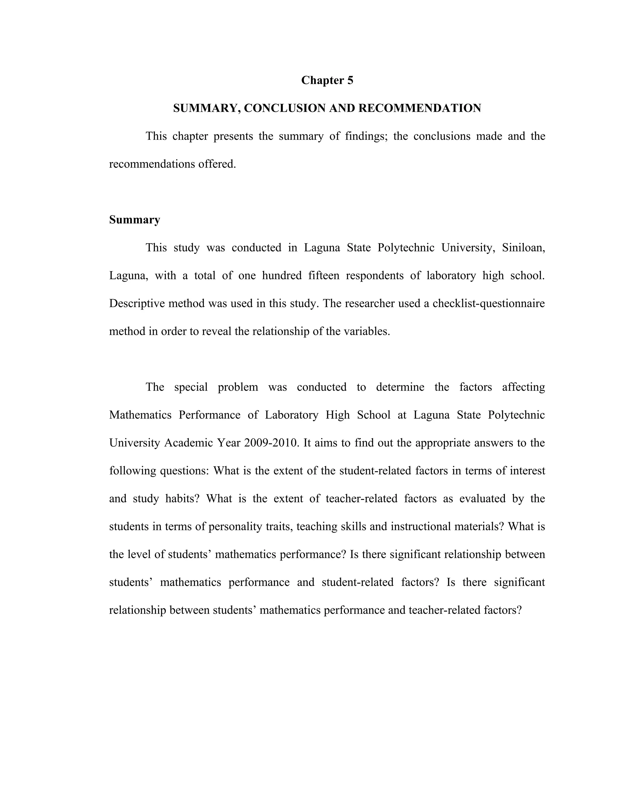This chapter summarizes the findings, conclusions, and recommendations of the study. The study examined factors affecting mathematics performance of 115 high school students. Descriptive methods were used to determine the extent of student factors like interest and study habits, and teacher factors like personality, teaching skills, and materials. It was concluded that there were no significant relationships between mathematics performance and the student and teacher factors. Recommendations included further research on relationships to mathematics and study habits, and encouraging teachers to use interactive techniques to boost math interest.