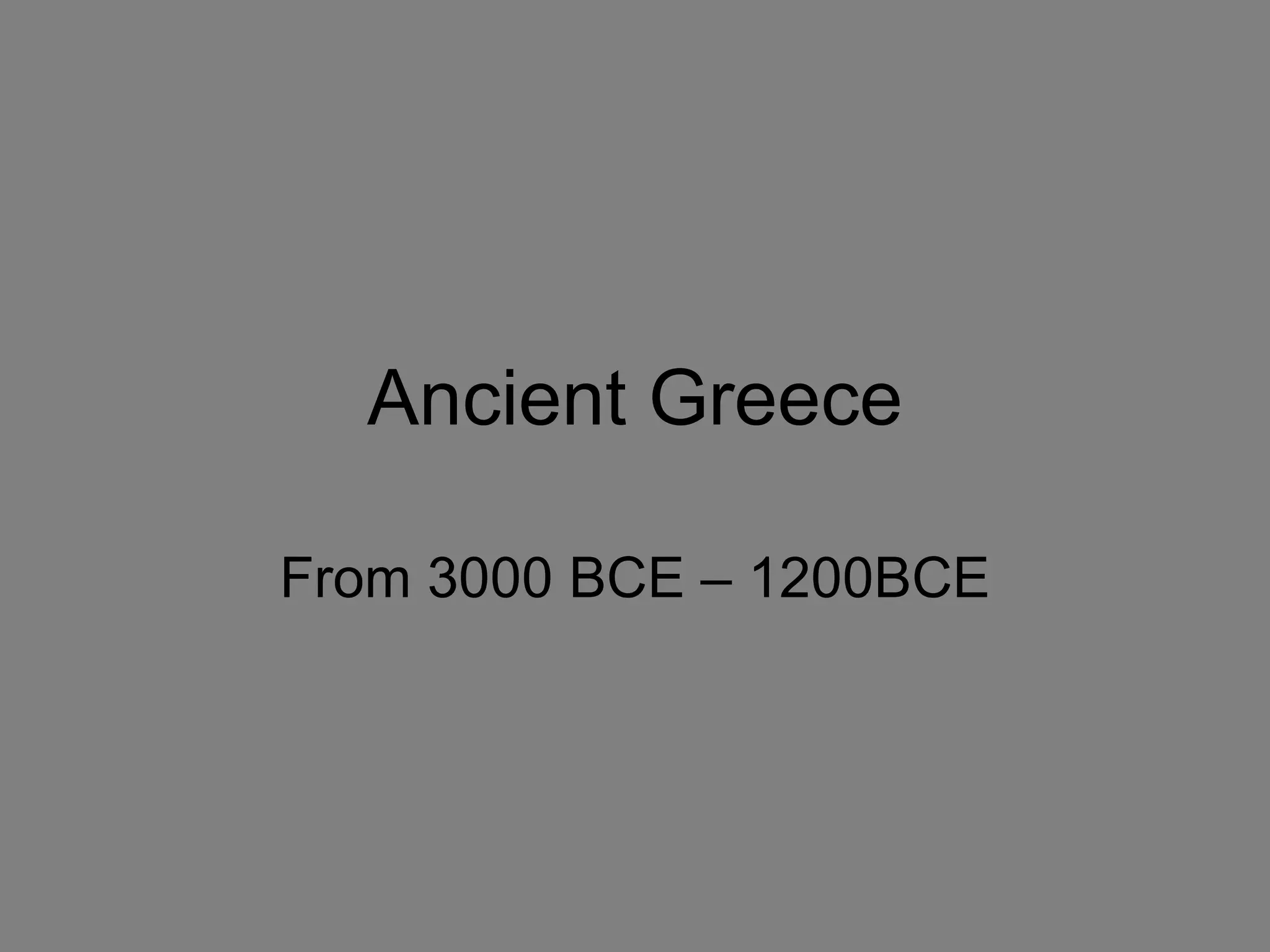 Ancient Greece from 3000 BCE to 1200 BCE saw the rise and fall of two early civilizations - the Minoans of Crete and the Mycenaeans of mainland Greece. The Minoans established cities on Crete like Knossos with palaces, temples, and workshops governed by priest-kings until their mysterious fall around 1400 BCE. They had a matriarchal society and economy based on farming, fishing, and trade. The Mycenaeans then dominated mainland Greece from 2000 BCE, living in fortified hilltop settlements and engaging in feudal agriculture and overseas trade until their collapse around 1200 BCE, coinciding with the Trojan War and the arrival of the Dorians.