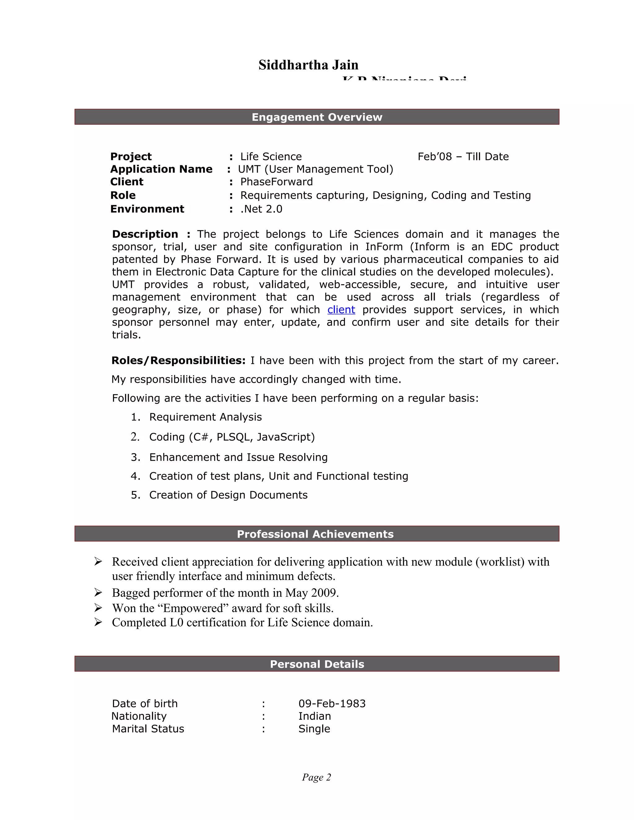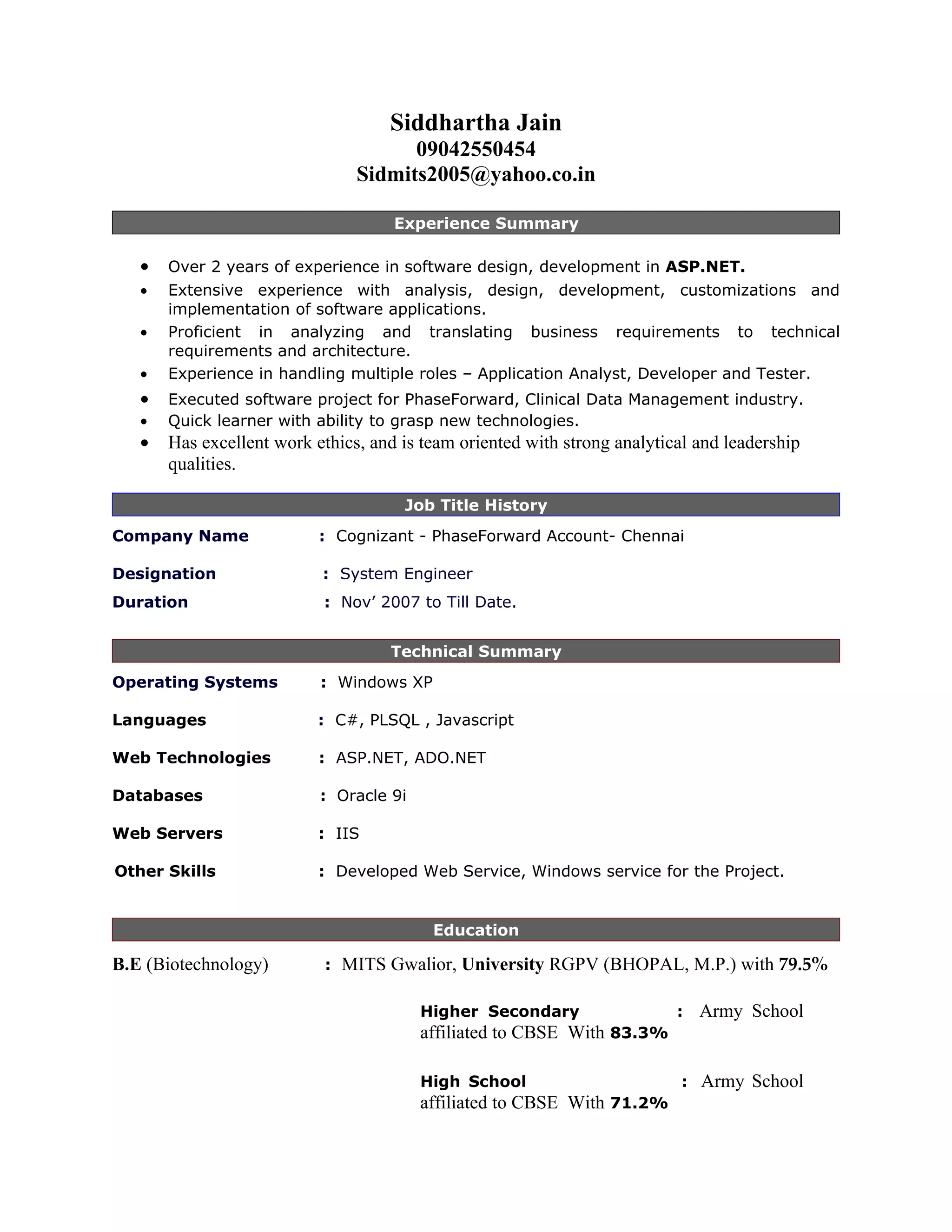 Siddhartha Jain has over 2 years of experience in software development using ASP.NET. He has experience with analysis, design, development, customizations and implementation of software applications. He currently works as a System Engineer at Cognizant on the UMT project for PhaseForward, where he performs requirements gathering, design, coding, testing and enhancements for a user management tool used across clinical trials. He has a Bachelor's degree in Biotechnology and is proficient in technologies like C#, ASP.NET, Oracle and software development processes.