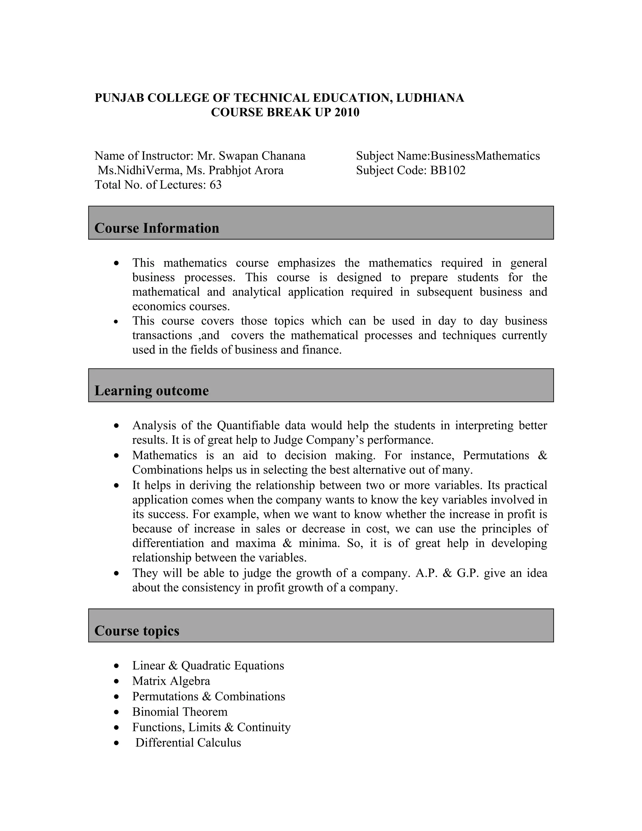 The document provides information about the Business Mathematics course offered at Punjab College of Technical Education in Ludhiana. [1] It outlines the course topics which include matrix algebra, binomial theorem, functions, limits, and calculus among others. [2] The learning outcomes, textbooks, assignments, tests, and lecture schedule with topics are also detailed. [3] The document comprehensively outlines the structure and components of the Business Mathematics course.