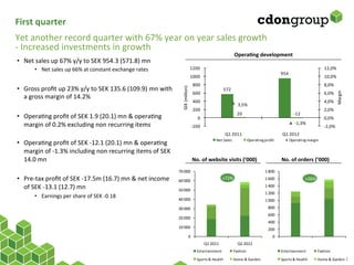- Sales for the first quarter of 2012 increased 67% year-over-year to SEK 954.3 million due to strong growth across all business segments. However, operating profit declined to SEK -12.1 million from SEK 20.1 million a year ago due to increased investments in growth initiatives and non-recurring costs of SEK 14 million.