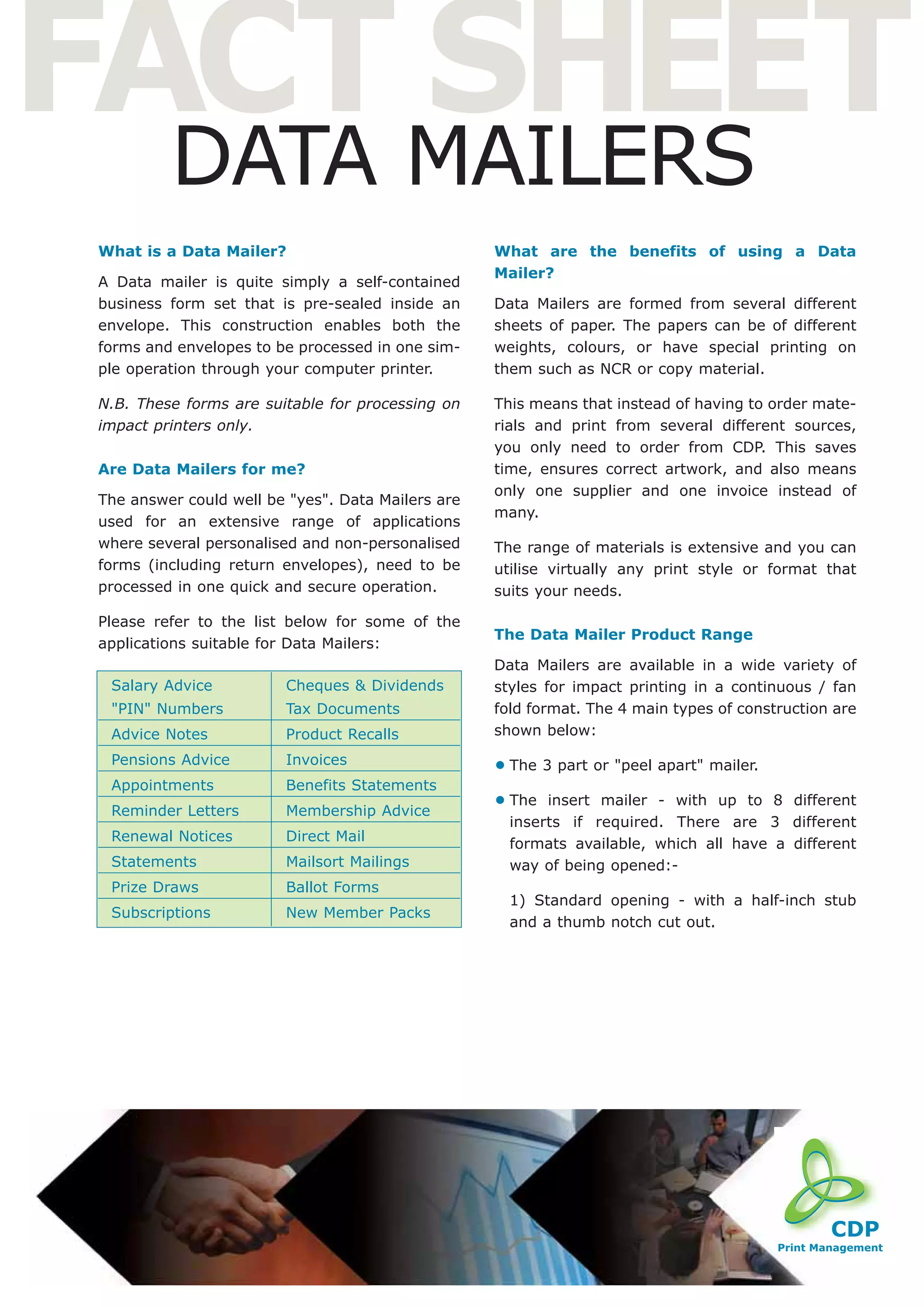 Data mailers are pre-sealed business forms that can include multiple printed inserts processed together through a printer. They provide time and cost savings over traditional mailings that require separate ordering, printing, and assembly of materials. Benefits of data mailers include a unified appearance, adaptability through various available features, security of confidential information, and reduced errors versus traditional mailings.