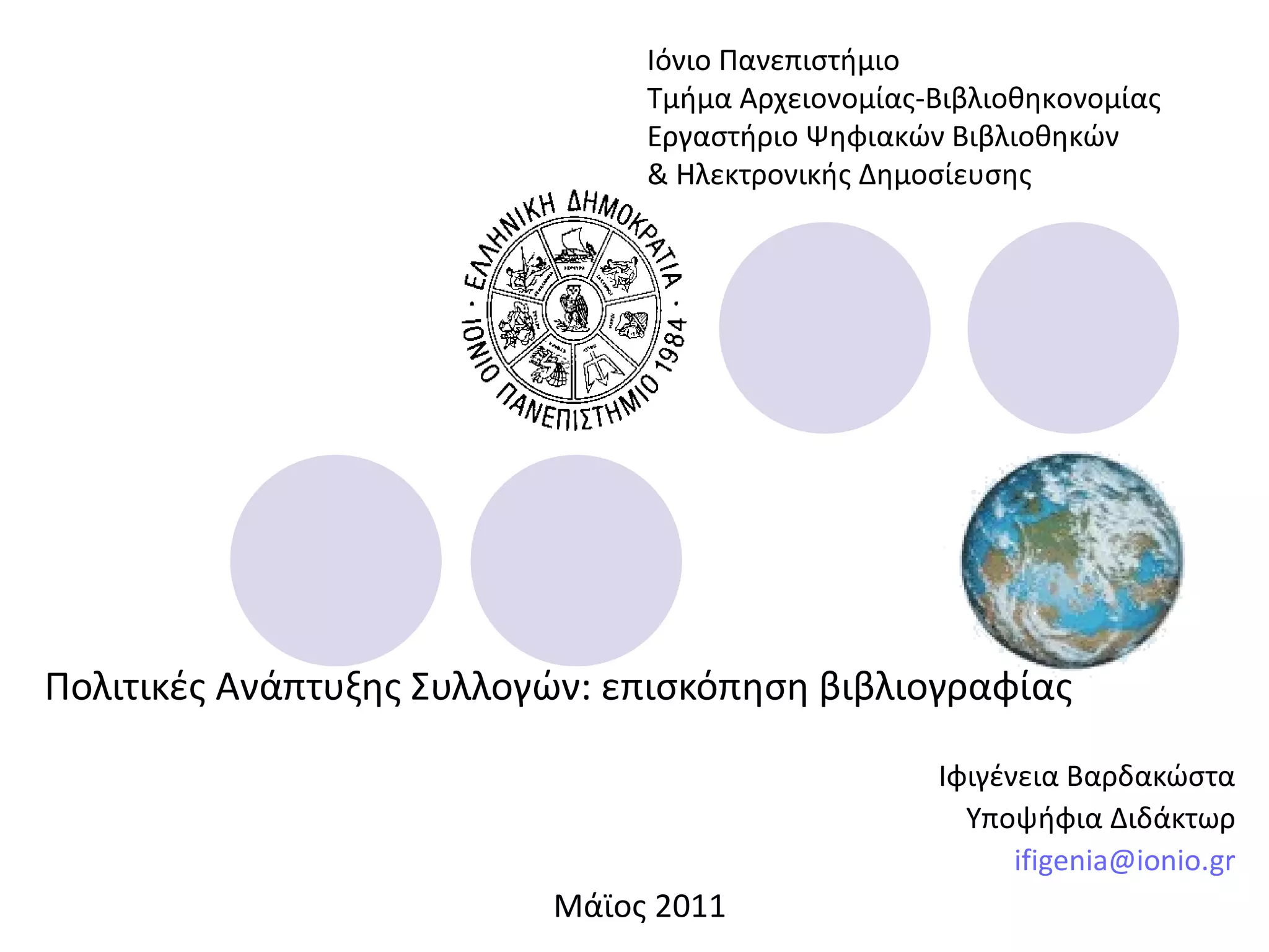 ΒΙΒΛΙΟΓΡΑΦΙΑ (3)Martindale, J. (2004) “GIS Librarianship:suggestions for entrylevel academic professionals. The Journal of Academic Librarianship, 30(1), 67-72 Nabe, J. (2011) “Changing the organization of collection development”, Collection Management , 36(3), pp.3-16 Olatunji Olaojo, P. and Akewukereke, M.A. (2006) “Collection development t policies:ground rules for planning university libraries” Library Philosophy and Practice 9(1) pp.1-5 Pastine, M. (1998) ‘What library directors want collection development librarians to know” Against the Grain , 10(2), pp.20-22 Phillips, L.(2003) Hit the ground running: collection developmetn skills for new selectors and bibliographers. ALA Midwinter Meeting,Toronto Canada Sanchez Vignau, B.S. and Meneses, G. (2005) « Collection development in university libraries : a space for reflection» Collection Building , 24(1), pp.35-43 Sanchez Vignau, B.S. and Presno Quesada, I.L. (2006) “Collection development in a digital environment: an imperative for information organizations in the twenty-first century” Collection Building , 25(4), pp.139-144