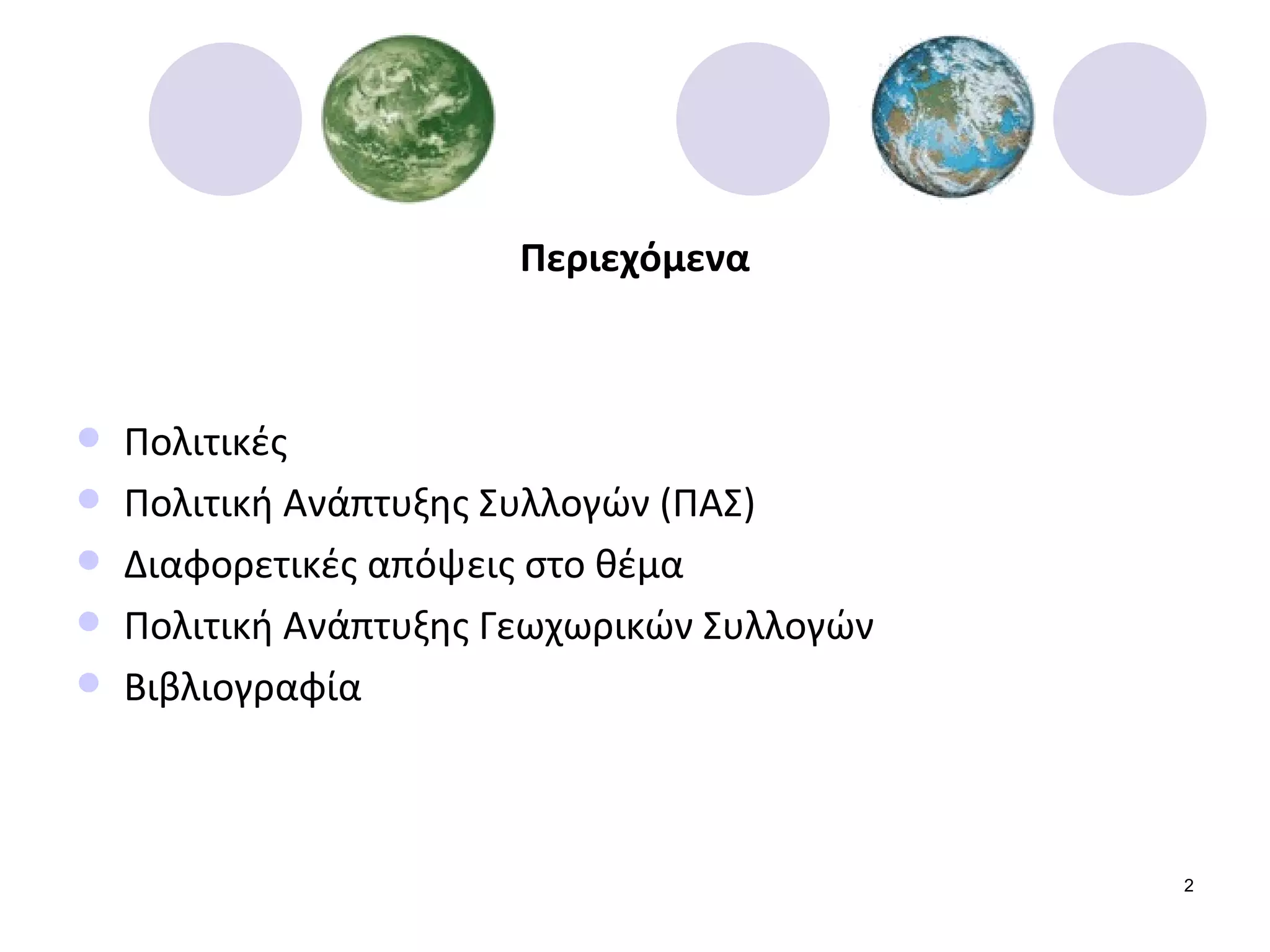 Περιεχόμενα Πολιτικές ΠολιτικήΑνάπτυξης Συλλογών (ΠΑΣ) Διαφορετικές απόψεις στο θέμα Πολιτική Ανάπτυξης Γεωχωρικών Συλλογών Βιβλιογραφία