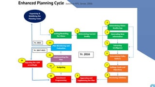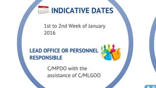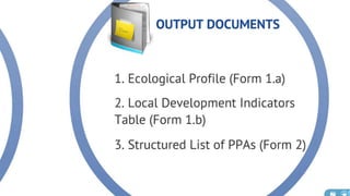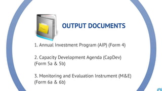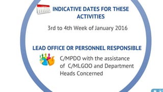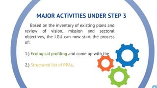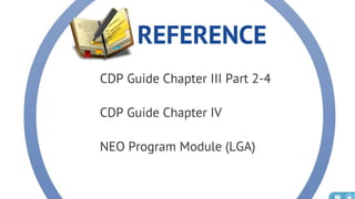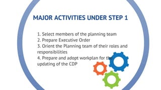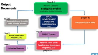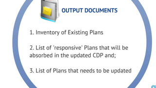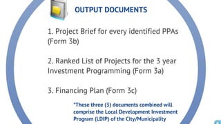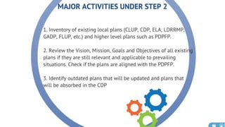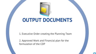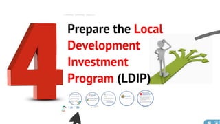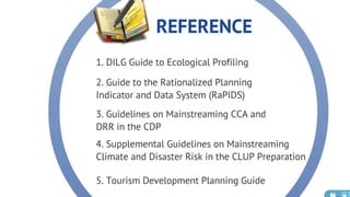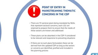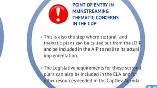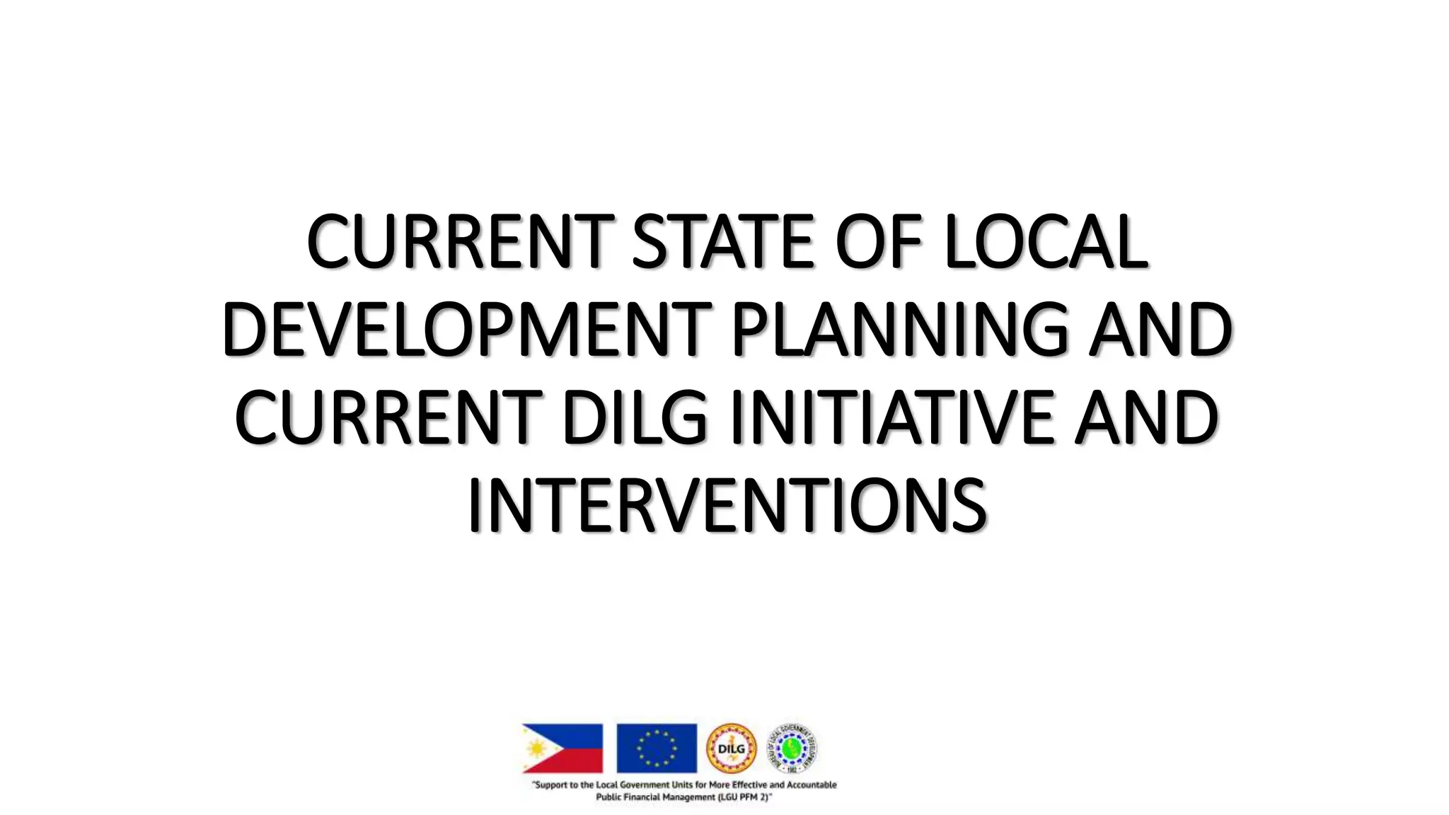 The document discusses the current state of local development planning in the Philippines and initiatives by the Department of the Interior and Local Government (DILG) to address issues. Key issues include inactive local development councils, lack of linkages between plans, weak plan-budget linkages, and lack of resources and competency for planning. The DILG is working to mainstream themes like disaster risk reduction and gender into local plans through new policies and knowledge products. It is also promoting rationalized planning processes and indicators to improve plan formulation, budgeting, implementation and monitoring.