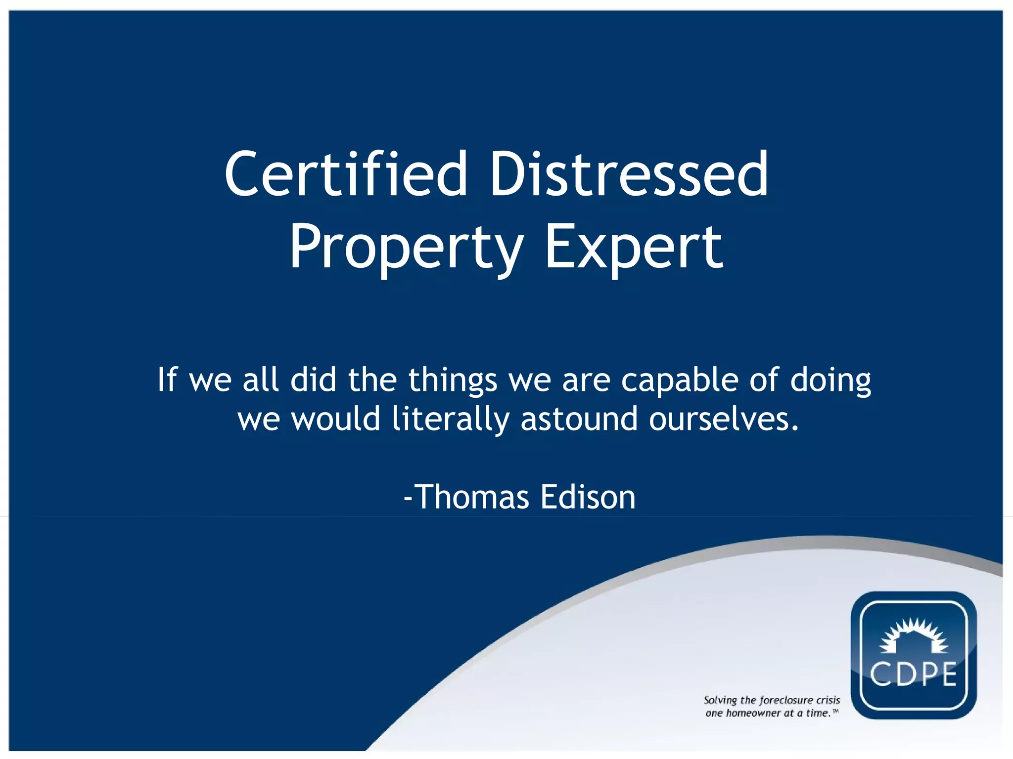The document outlines the current state of mortgage delinquencies and foreclosures in the U.S., providing statistics on various loan types as of Q4 2009. It explains the foreclosure process, reasons to avoid it, and outlines potential solutions for distressed homeowners, such as reinstatement, forbearance, selling, and short sales. Additionally, it emphasizes the importance of working with a certified distressed property expert (CDPE) to navigate these options effectively.